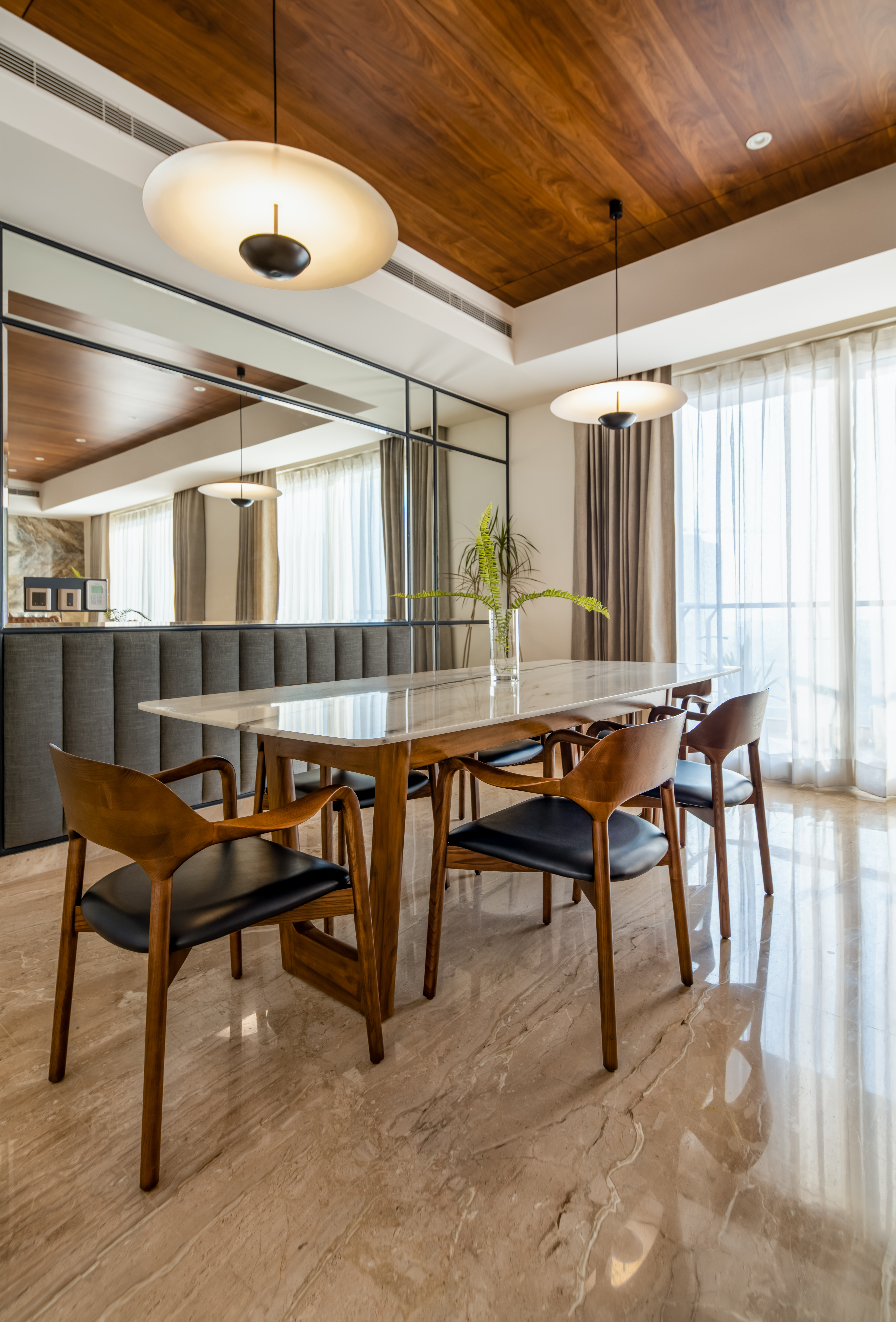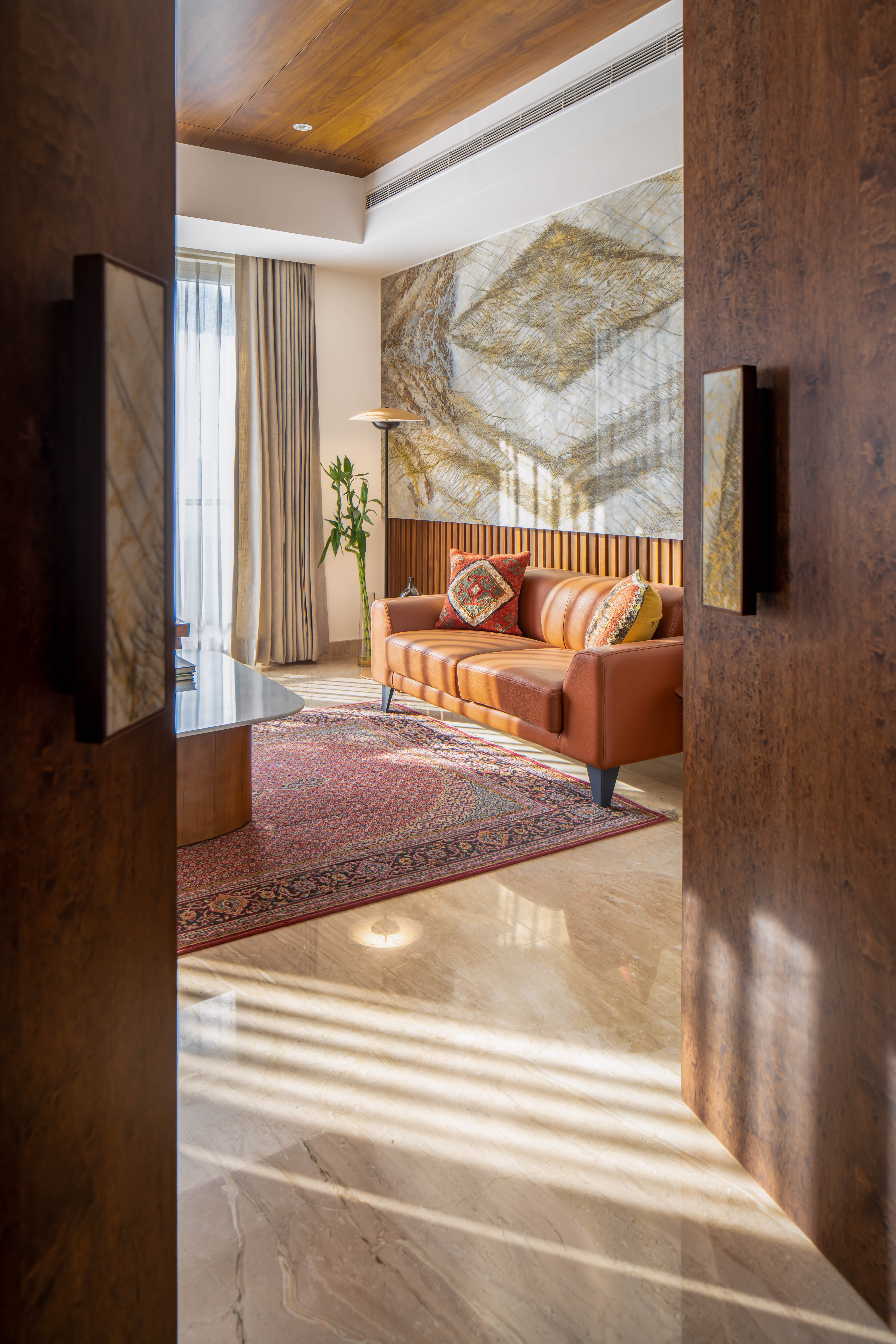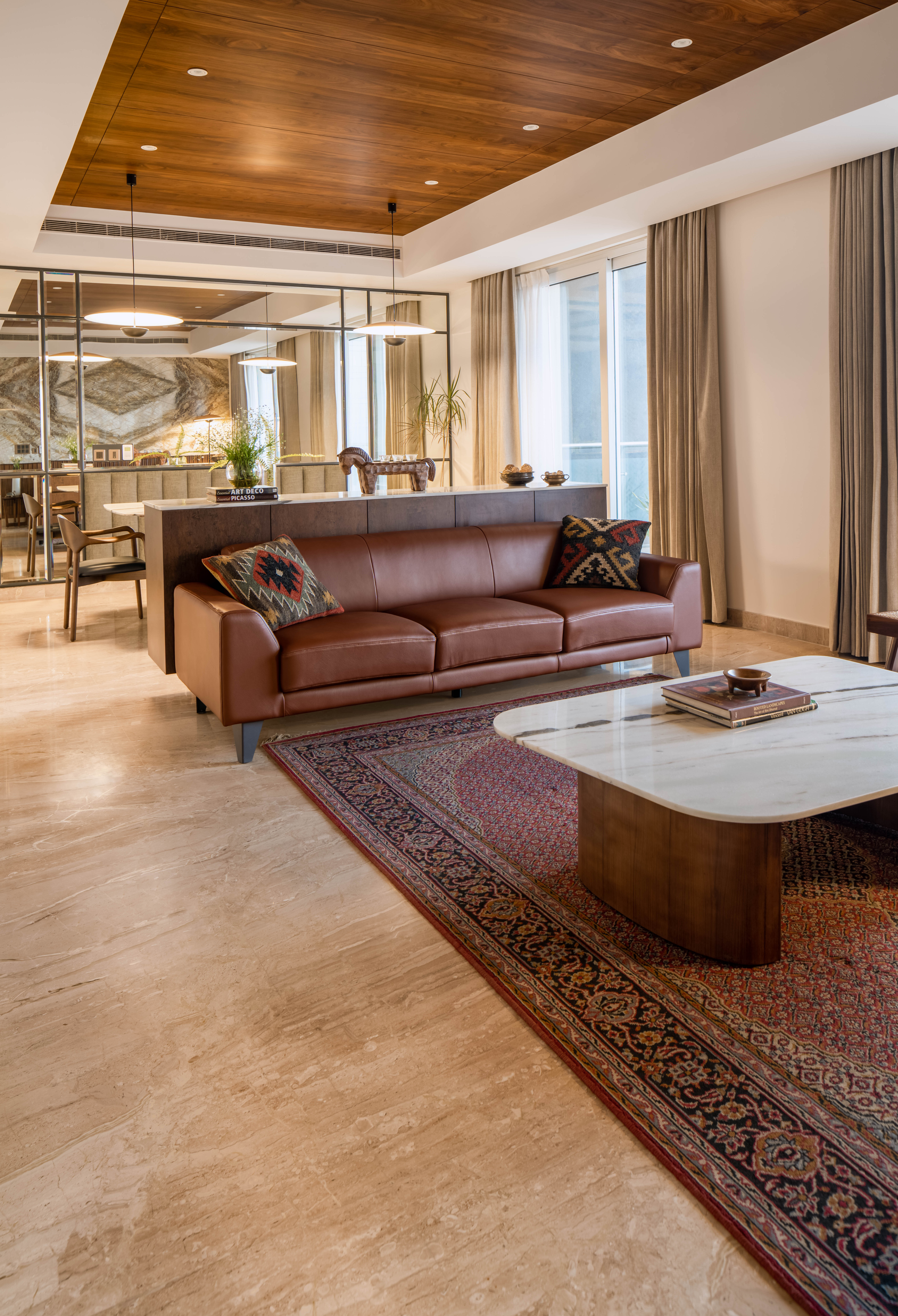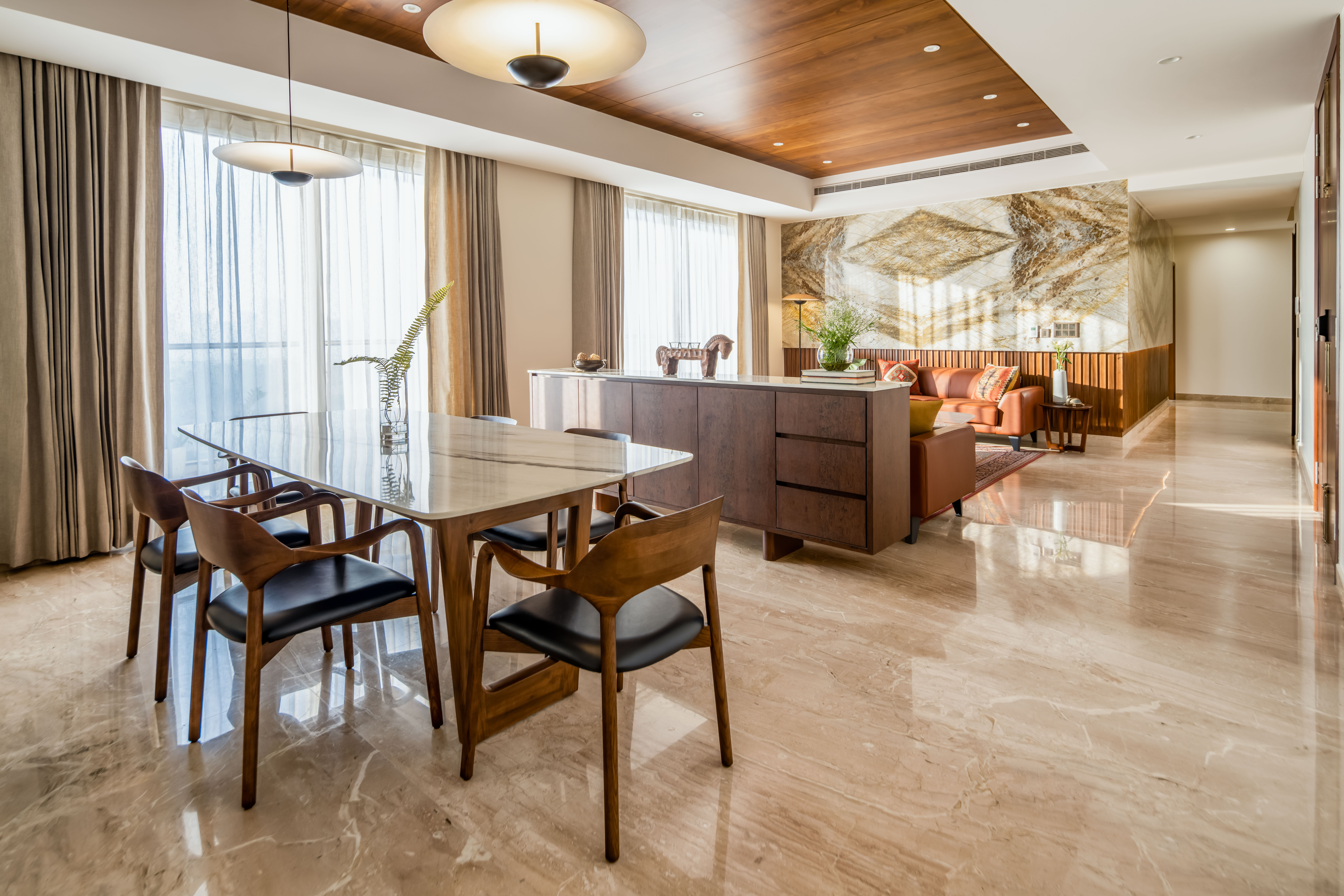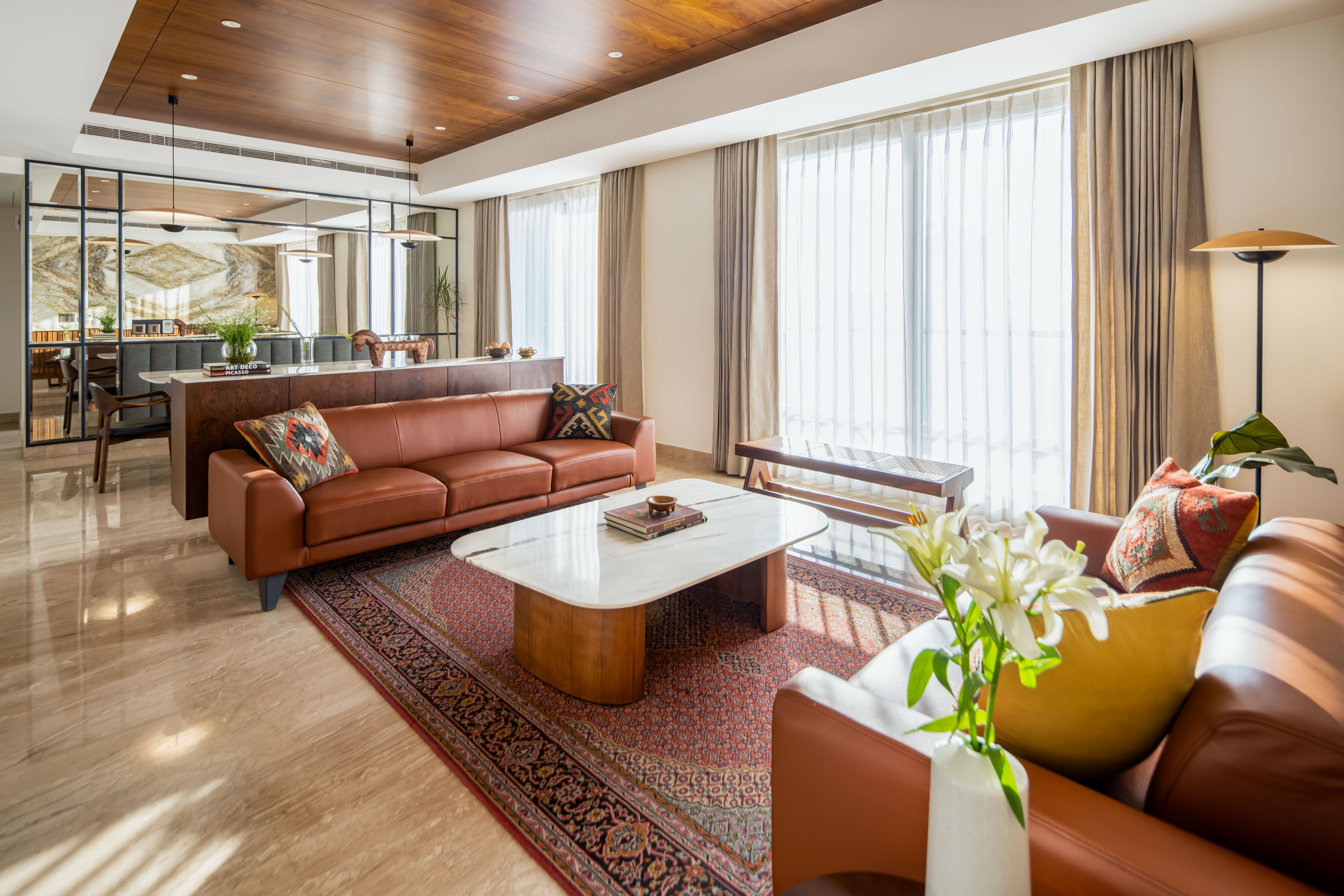 The brief focused on designing a comfortable residential interior with attention to everyday usability and spatial flow. The concept aimed to create a warm, functional home with clear zoning and balanced material use. The residence explores a balance between mid-century modern design and understated luxury, resulting in interiors that feel calm, warm, and composed. Each space follows a consistent design language where richness is introduced thoughtfully rather than overtly. The west-facing entrance allows generous natural light to enter the home from late afternoon through sunset, shaping the spatial experience and influencing material and furniture placement. This orientation was leveraged to enhance warmth and visual comfort within the living areas. The design balances statement elements, such as bold and luxurious artworks, with clean, modern furniture forms. This contrast allows each element to stand out while maintaining harmony across the interior, creating a home that feels both refined and inviting.