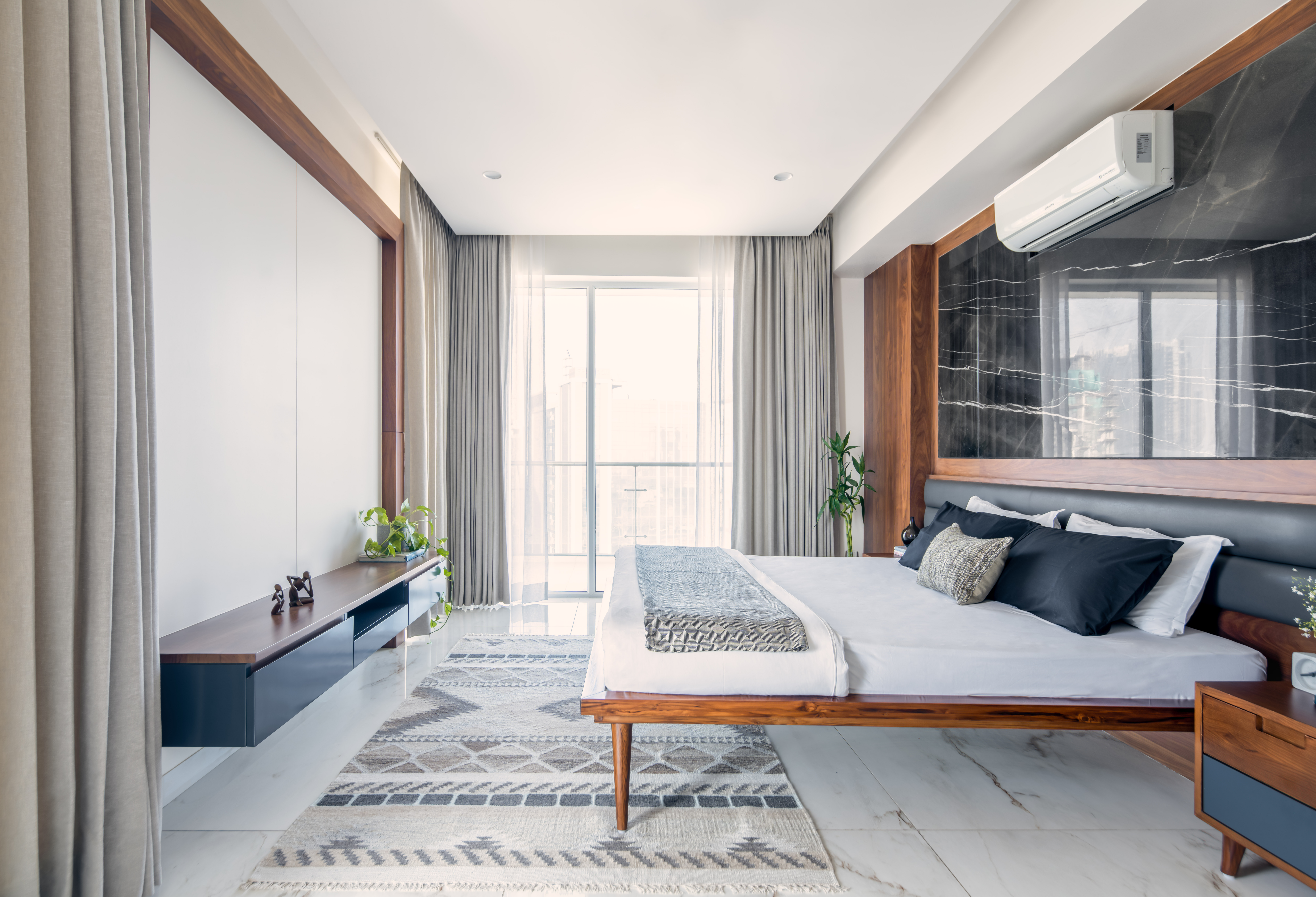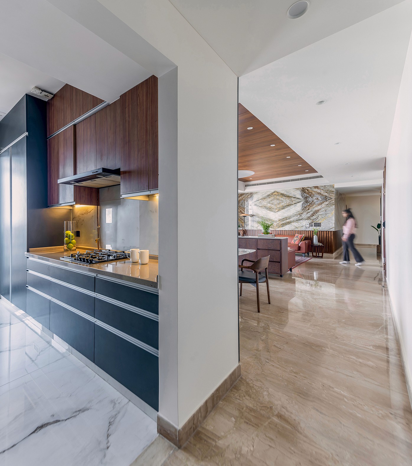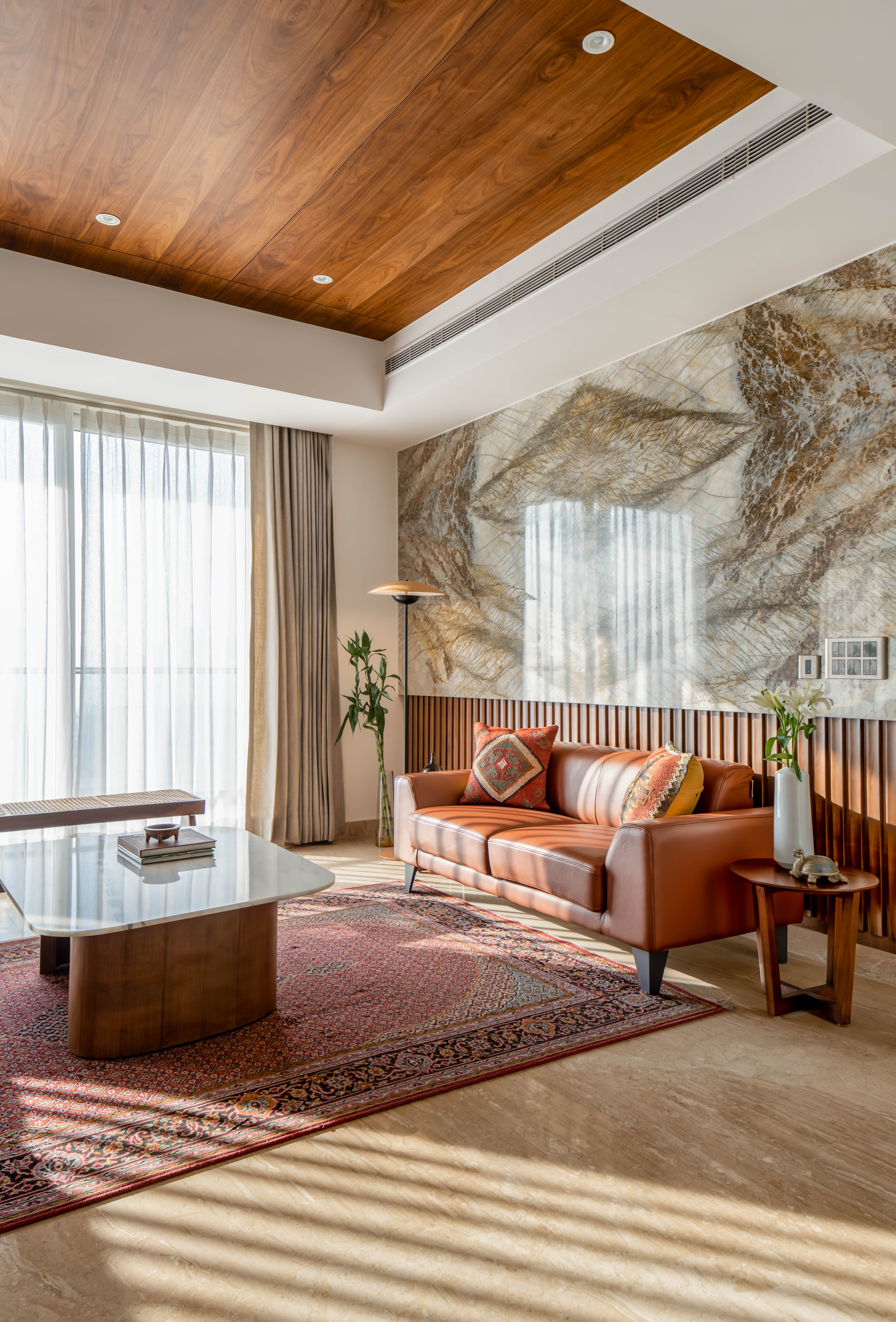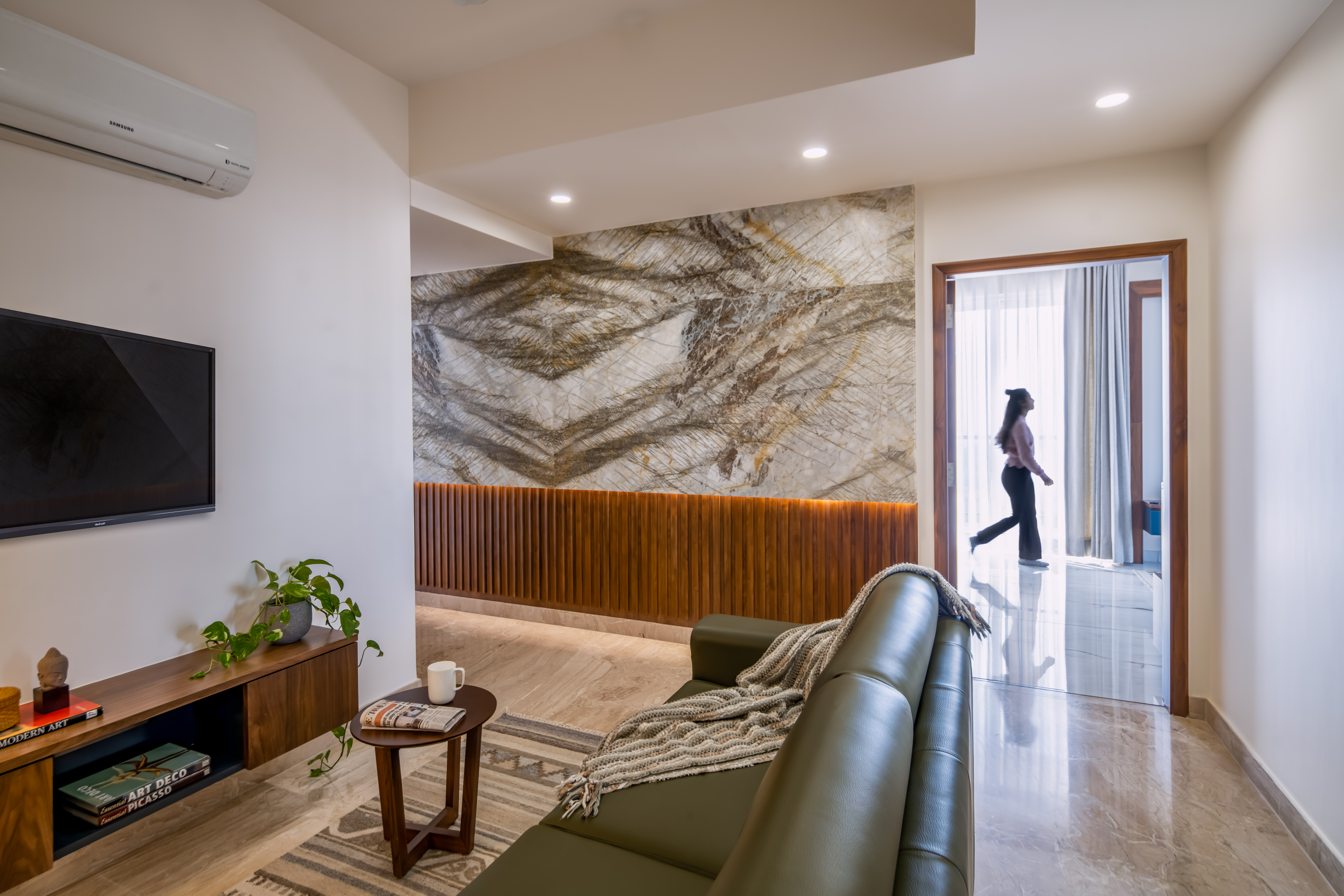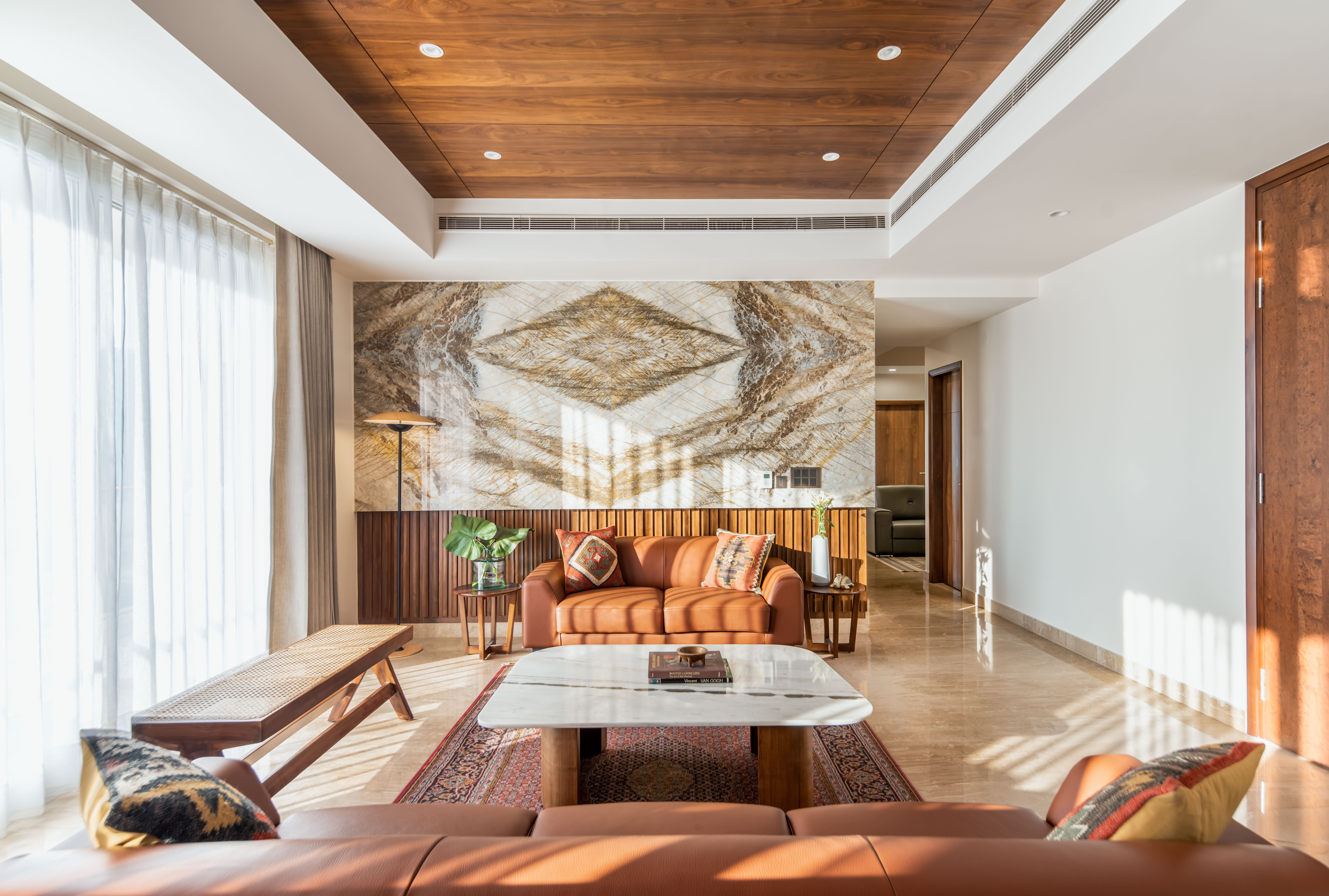 The brief focused on designing a comfortable residential interior with attention to everyday usability and spatial flow. The concept aimed to create a warm, functional home with clear zoning and balanced material use. The residence explores a balance between mid-century modern design and understated luxury, resulting in interiors that feel calm, warm, and composed. Each space follows a consistent design language where richness is introduced thoughtfully rather than overtly. The west-facing entrance allows generous natural light to enter the home from late afternoon through sunset, shaping the spatial experience and influencing material and furniture placement. This orientation was leveraged to enhance warmth and visual comfort within the living areas. The design balances statement elements, such as bold and luxurious artworks, with clean, modern furniture forms. This contrast allows each element to stand out while maintaining harmony across the interior, creating a home that feels both refined and inviting.